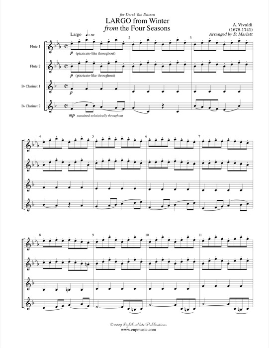 This incredibly popular work has been adapted for 2 flutes and 2 clarinets. It is a 2nd clarinet feature from top to bottom. The lyrical theme is contrasted by the pizzicato-like articulations in the other three voices.
