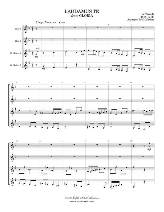 The Gloria by Antonio Vivaldi is truly a magnificent work. The Laudamus Te is a vocal duet arranged here for 2 flutes and 2 clarinets with duetting flutes and the clarinets accompanying. This duet is typical of the music of Vivaldi with imitative scale passages and melodic lines cleverly intertwining. |