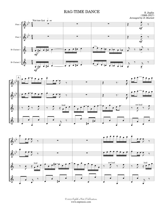 This is a famous Joplin rag which has been arranged for 2 flutes and 2 clarinets. The flutes and clarinets alternate melodic sections and even the 2nd clarinet gets a section of melody. This is a fun up-beat tune to add something different to your next concert. |