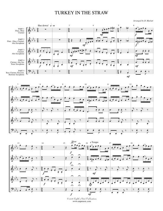 Turkey in the Straw is true hoe-down music and should be played with the energy of square dancers. The syncopated rhythms combined with the short crisp articulations make this a fun tune for both listener and performer. In this spirit of fun, a solo has been given to the lowest voice through the middle section. |