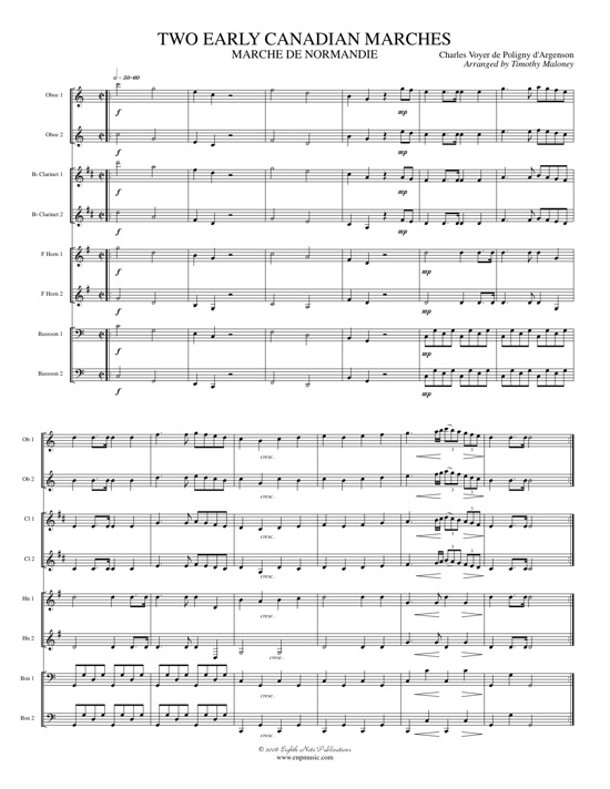 These two marches are the oldest extant secular music composed in Canada. The Royal Fusiliers Arrival at Quebec was written in honour of the arrival of the newest regiment from England and its commanding officer. An inscription on the manuscript of the Marche de Normandie identifies Charles Voyer de Poligny dArgenson as the composer of that work, and from the available evidence it seems likely that both marches were written by the same person. They are arranged for a woodwind ensemble consisting of piccolo, flute, 2 oboes, 2 clarinets, 2 horns and 2 bassoons. |