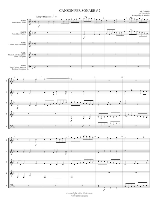 There have been many recordings of the famous Gabrieli canzoni for various combinations of instruments. This arrangement for interchangeable woodwinds is a welcome addition to this repertoire. Antiphonal spacing is always a successful performance practice allowing the passing of melodic material to be enhanced by the spatial distance.