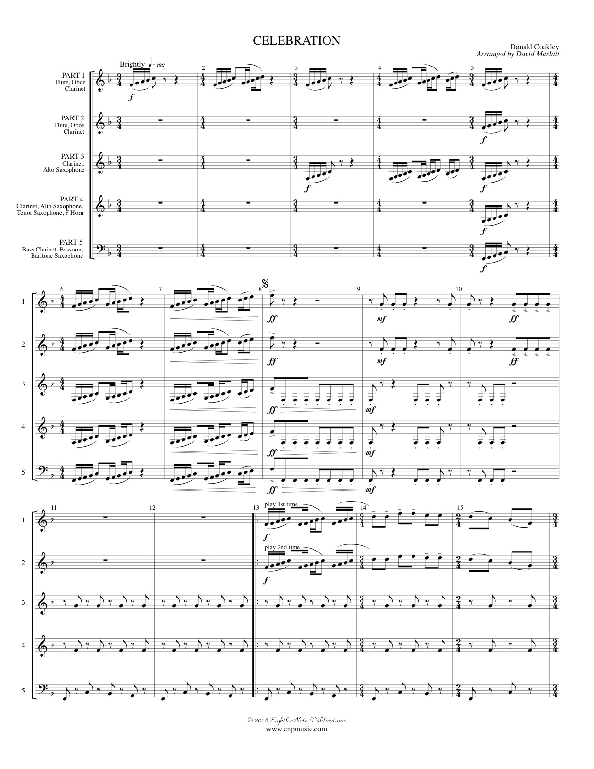 PART 1 - Flute, Oboe, Clarinet PART 2 - Flute, Oboe, Clarinet PART 3 - Clarinet, Alto Saxophone PART 4 - Clarinet, Alto Saxophone, Tenor Saxophone, F Horn PART 5 - Bass Clarinet, Bassoon, Baritone Saxophone |