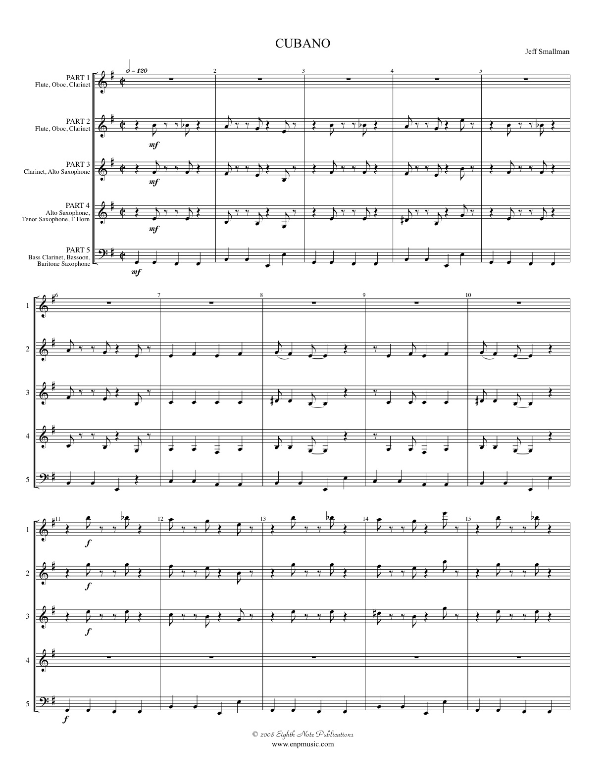 Based on the groovy rhythms of Cuba, Jeff Smallman has created a brilliant showpiece for interchangeable woodwind ensemble. Energetic writing has all players flying and all parts are interesting. This difficult work is suitable for more advanced ensembles and should be well received by audiences.