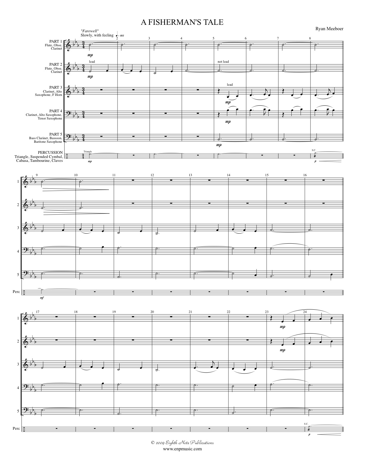 Using the style of Canadian folk songs from the east coast and the story telling features of Newfoundland, A Fisherman s Tale is a piece about a trip out into the ocean. The piece opens with the solemn, chorale-like movement Farewell, as the fisherman leaves his home and family to begin the excursion, and closes with Return to Harbour, an up tempo movement representing the worker s successful homecoming.