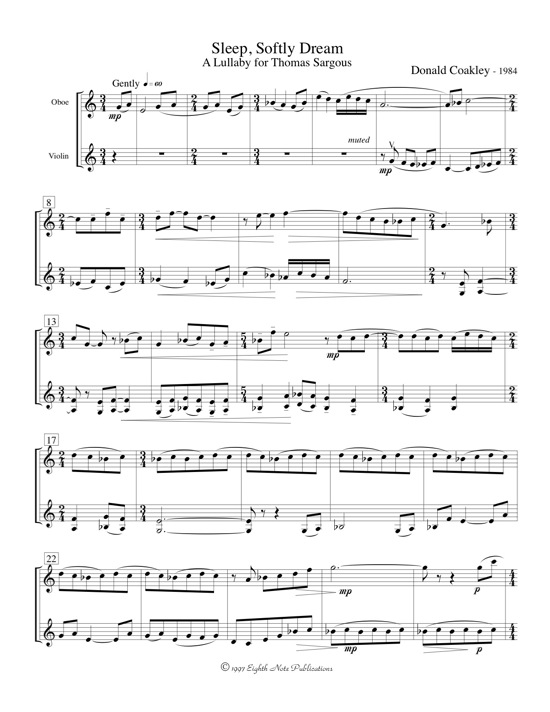 Sleep, Softly Dream is dedicated to the son of friends of the composer. It was written at the time of his birth. The instrumentation relates to the parents who are gifted musicians, one an oboist the other a violinist.