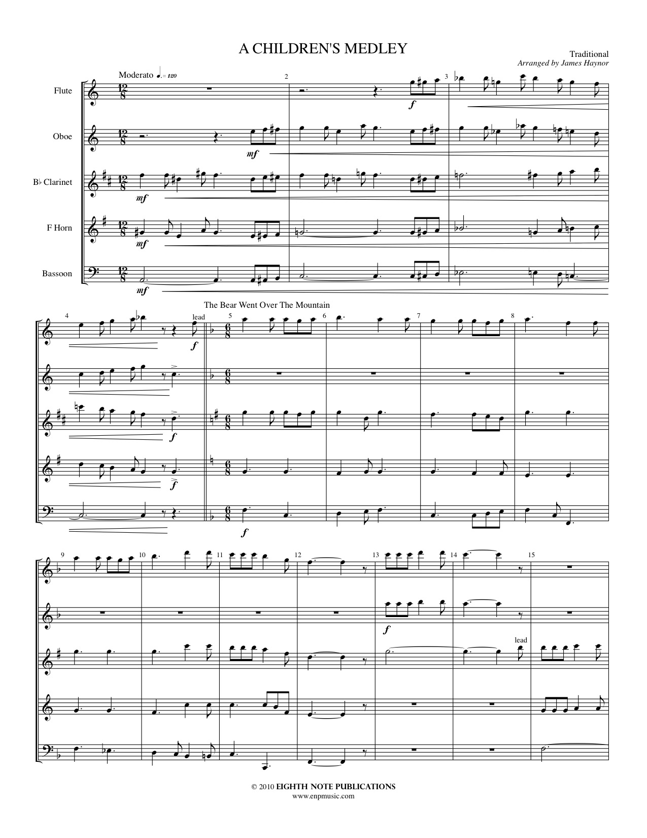 The tunes that comprise this cleverly written medley have a warm place in the hearts of us all. These tunes include; The Bear went over the Mountain, The Farmer in the Dell, Twinkle, Twinkle, Little Star, One, Two, Three Little Indians, My Bonnie Lies over the Ocean, Old McDonald had a Farm and numerous quotes from other children s favorites. Great for kiddie concerts played by a working quintet. |