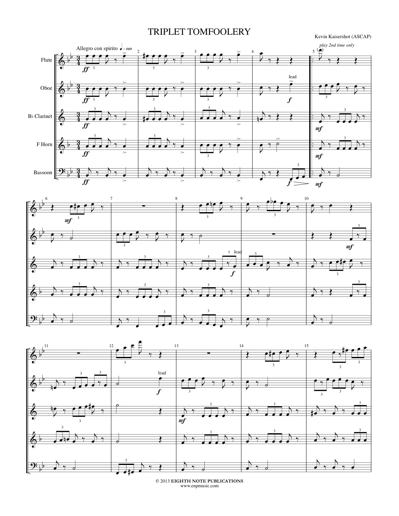 Triplet Tomfoolery is a mid-easy level piece designed to teach the triplet skill to the young woodwind quintet. Spiced with chromaticism, this is a lot of fun to play and there is a lot of fooling around for everyone.