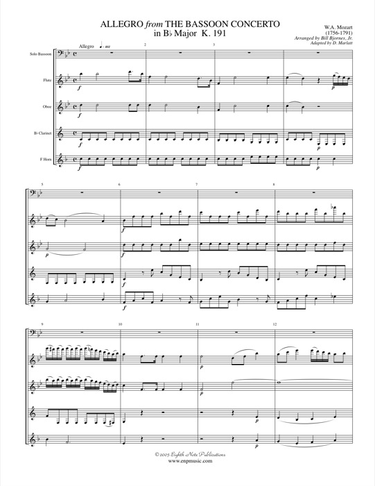 Mozart wrote 27 concerti, including the Concerto in B Flat for Bassoon and Orchestra, K 191. This arrangement for brass quintet was transcribed from the orchestral score to feature the bassoonist in the quintet.