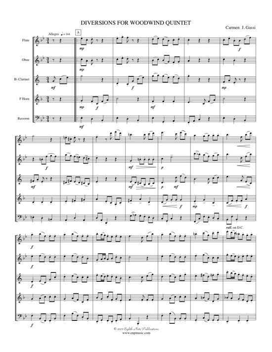 This piece, set in 3 movements, is full of texture and colour changes and makes the most of the sonorities available to a woodwind quintet. Clever original writing and some subtle musical humour add a lot to the appeal of this work.
