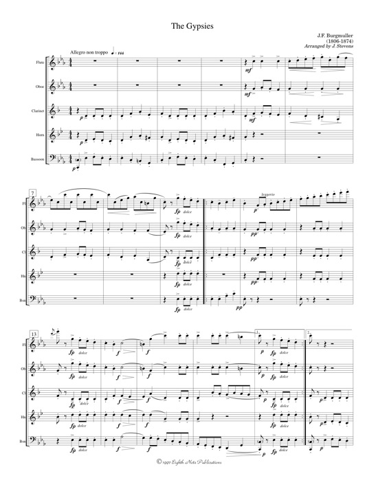 An arrangement of this piano favourite, The Gypsies works well for this versatile ensemble. The melody is passed throughout the group but none of the parts is too difficult. It is a character piece depicting the mysterious nature of gypsies on their travels and is sure to be enjoyed by audiences. |